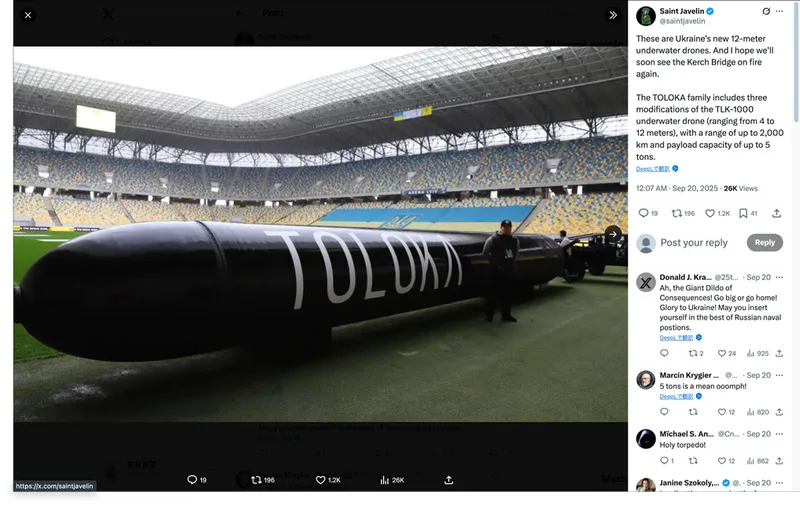 西部リビウの展示会で公開された「トロカ(TLK)-1000」は、全長約12メートル、最大で約5トンの弾頭を搭載可能とされる大型UUVで、黒海をめぐる軍事バランス、とりわけロシア側の重要目標であるケルチ橋(クリミア橋)などにとって新たな脅威となる可能性があります。