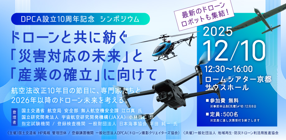 ドローンユーザー必見!! 航空局・JAXA・日本海事協会の登壇決定! 設立10周年記念シンポジウム 12月10日(水)ロームシアター京都で開催!